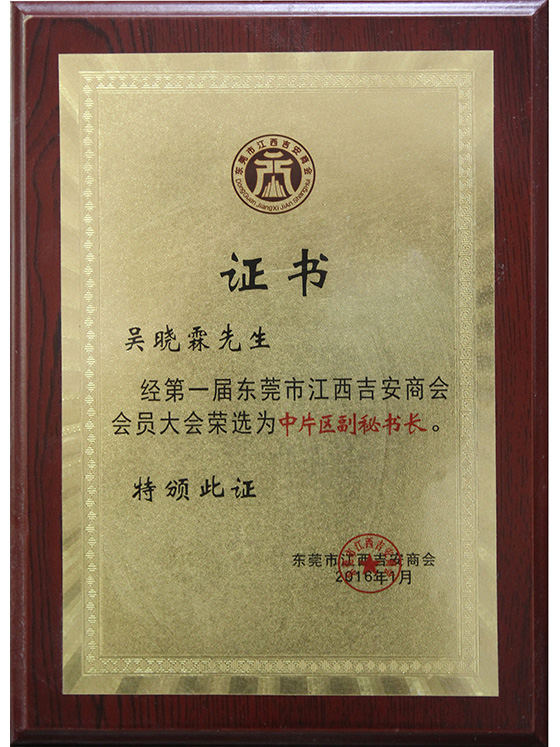 东莞市江西商会中片区副秘书长证书